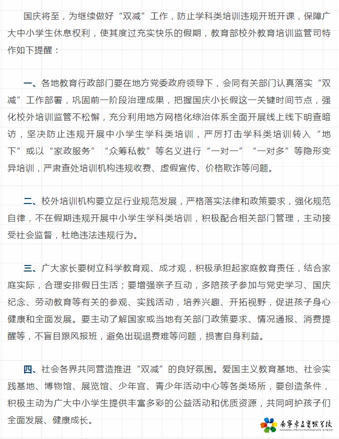 教育部校外教育培训监管司提醒:国庆期间不得违规开展学科类校外培训,给孩子们一个充实快乐的假期