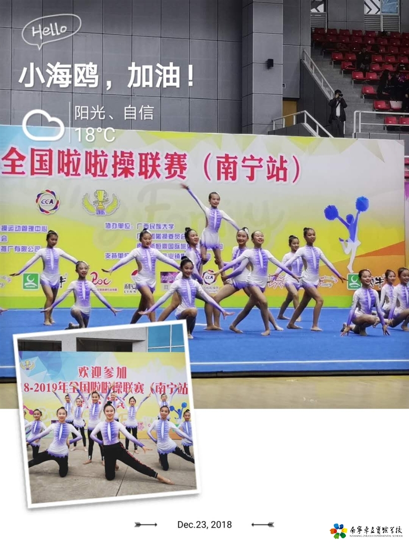 我们满怀喜悦告别2018,充满希望走进2019之时,学校捷报频传。2018年12月23日,我校啦啦操队参加2018——2019年全国啦啦操联赛(南宁站),再次荣获自选爵士和规定爵士双冠军。